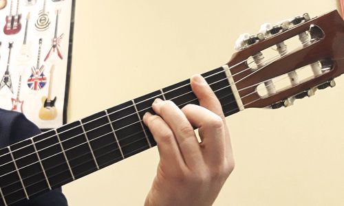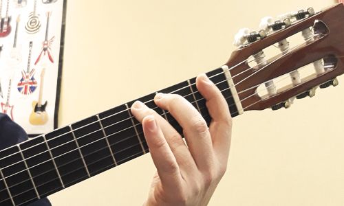 - Поставимо чотири пальці лівої руки на перші чотири лади шостої струни